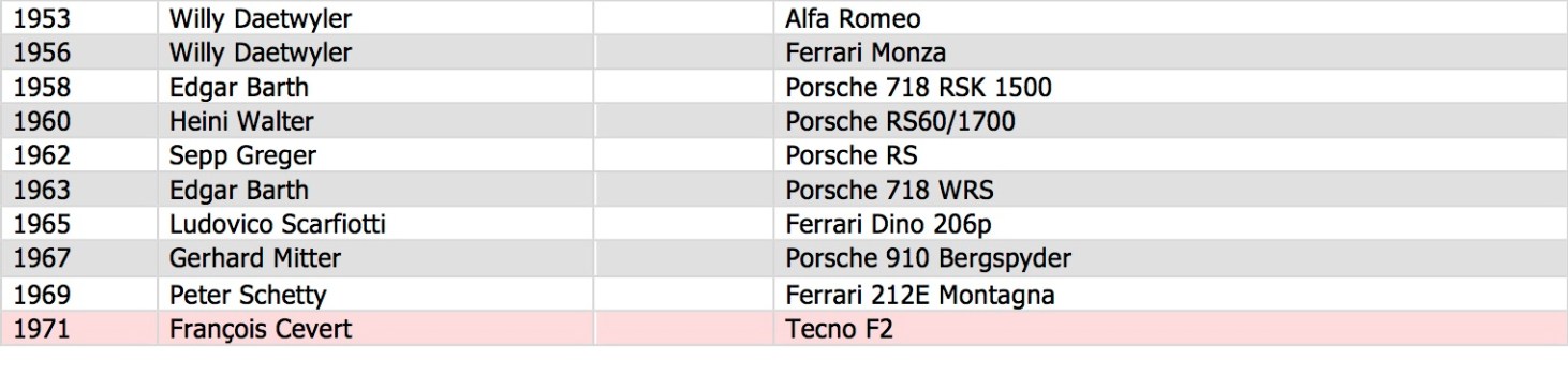 Tommy Spychinger Comme Ignazio Giunti ci-dessus, Spychiger n’a pas pu se construire un palmarès, tué à Monza à 31 ans. Détail sordide : sa Ferrari 365 P2 de la Scuderia Filipinetti a complétement brûlé et M. Filipinetti a rencontré tant de problèmes avec les douanes (Passavant non visé au retour puisqu’il n’y eu pas de retour !) que depuis cette affaire toutes les voitures de la Scuderia genevoise, de la Tourisme à la Formule 1 en passant pas les Prototypes, étaient immatriculées en Suisse comme la voiture de Monsieur Tout le Monde. Adieu aux passavants et triptyques merdiques…