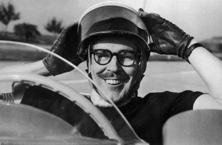 Cette photo a été prise lors de la Mille Miglia de 1954, alors que Reg Parnell semble faire des reproches à l’épave de l’Aston Martin qu’il vient de projeter contre une barrière.