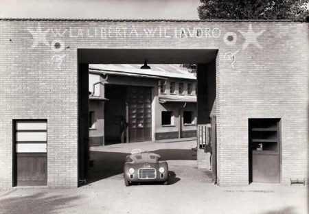 Cette photo représente la toute première Ferrari, le modèle 125S sortant de l’usine en 1947 (Eh oui on vient de fêter les 70 ans de cette marque prestigieuse !) Les ‘graffiti’ sur la façade montrent 2 fois le marteau et la faucille, un emblème qui ne doit pas être celui des actuels possesseurs de voitures de Maranello hein ? Tout en haut du mur l’inscription : W LA LIBERTÀ W IL LAVORO. Le W est utilisé en italien pour abréger ‘Evviva’. Donc sur le fronton de l’usine nous lisons